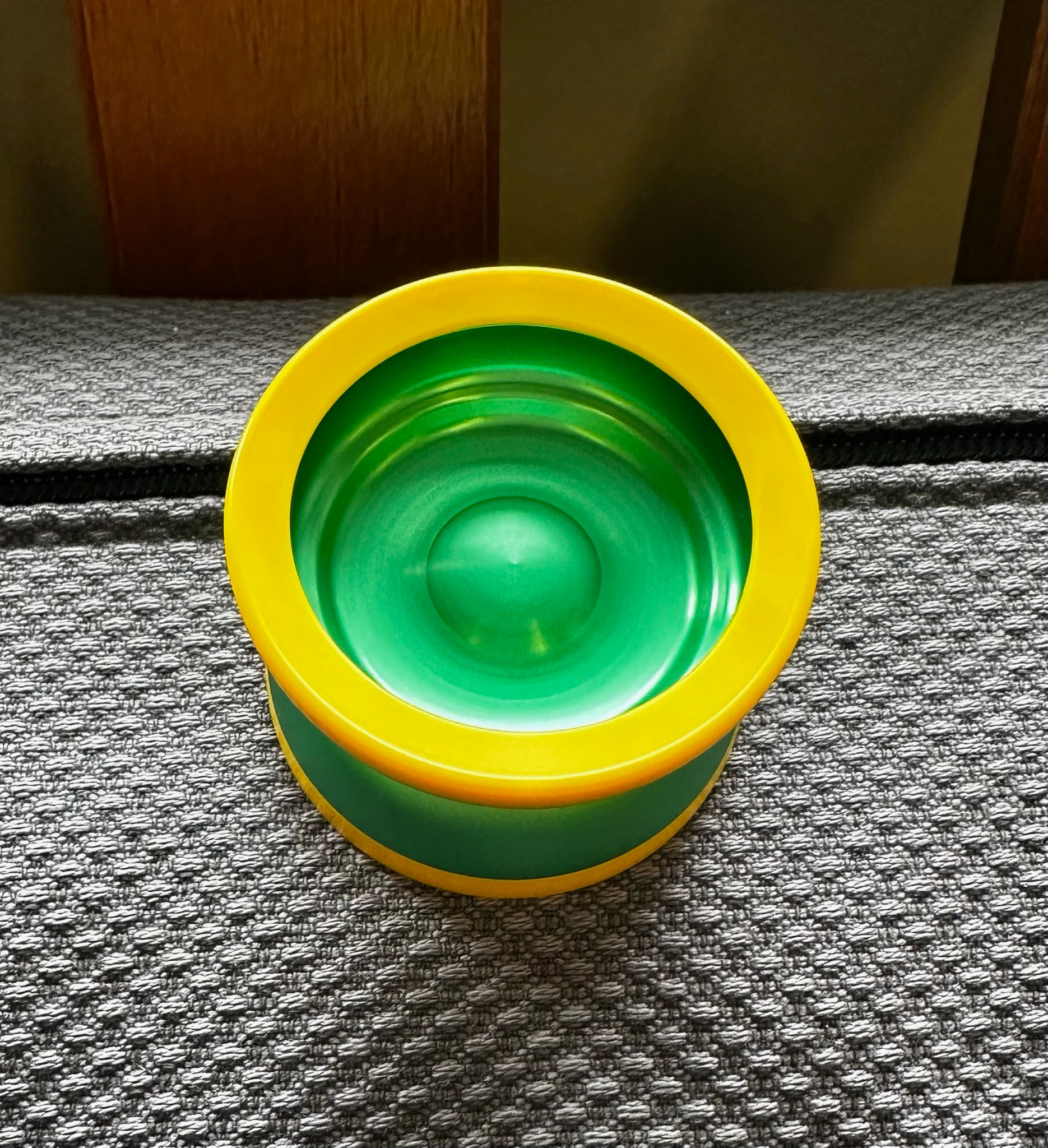 A bit finicky to tune and vibey in the way I hear they all are. This one has a bit of damage on the inside around the hole where the outer hub cap meets the inner, interchangeable bearing seat. Basically a strip of wood out if the middle. The damage doesn’t seem to have much effect on play? Either way, I keep a loop of yoyo string tucked behind the inner bearing seat to keep them level with the inner wall of the yoyo. Left the string on one side in a pic to show where I mean. If you are feeling adventurous, I kept the tiny woodchips if you’d like to try glueing them back on