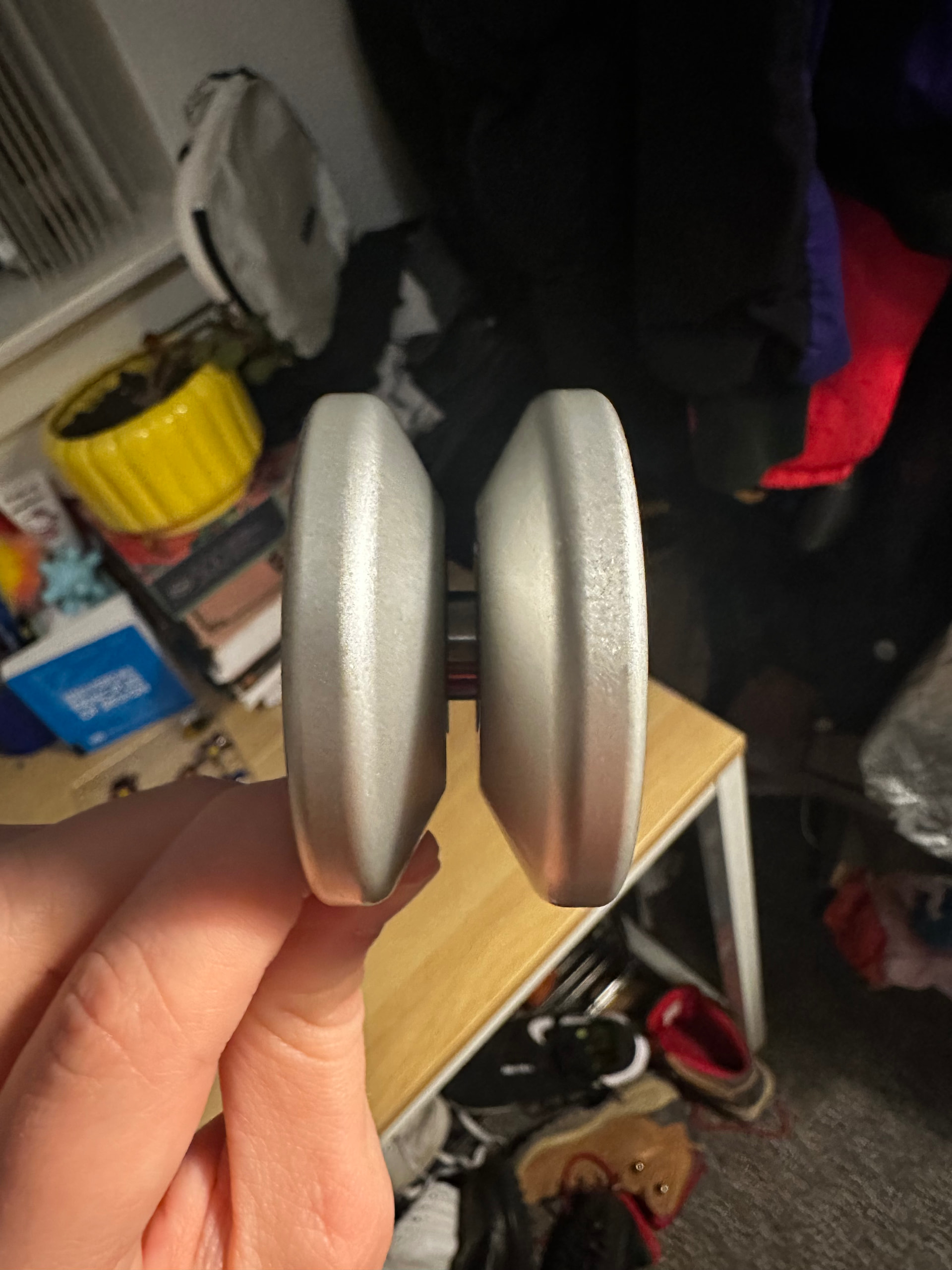 A bit finicky to tune and vibey in the way I hear they all are. This one has a bit of damage on the inside around the hole where the outer hub cap meets the inner, interchangeable bearing seat. Basically a strip of wood out if the middle. The damage doesn’t seem to have much effect on play? Either way, I keep a loop of yoyo string tucked behind the inner bearing seat to keep them level with the inner wall of the yoyo. Left the string on one side in a pic to show where I mean. If you are feeling adventurous, I kept the tiny woodchips if you’d like to try glueing them back on