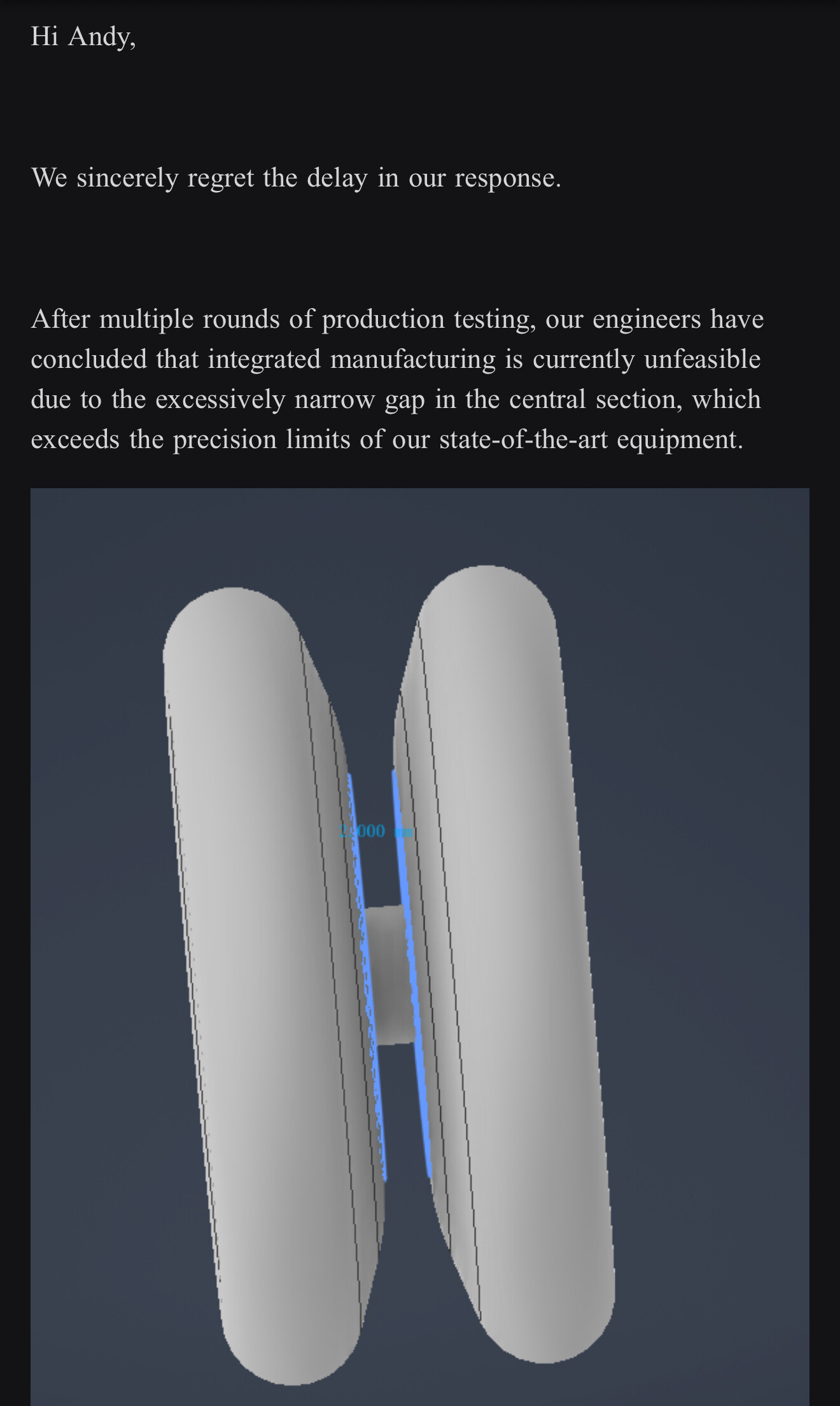 Shop from Mexico that tried to make one. Their state of the art equipment can’t handle a 2mm gap.