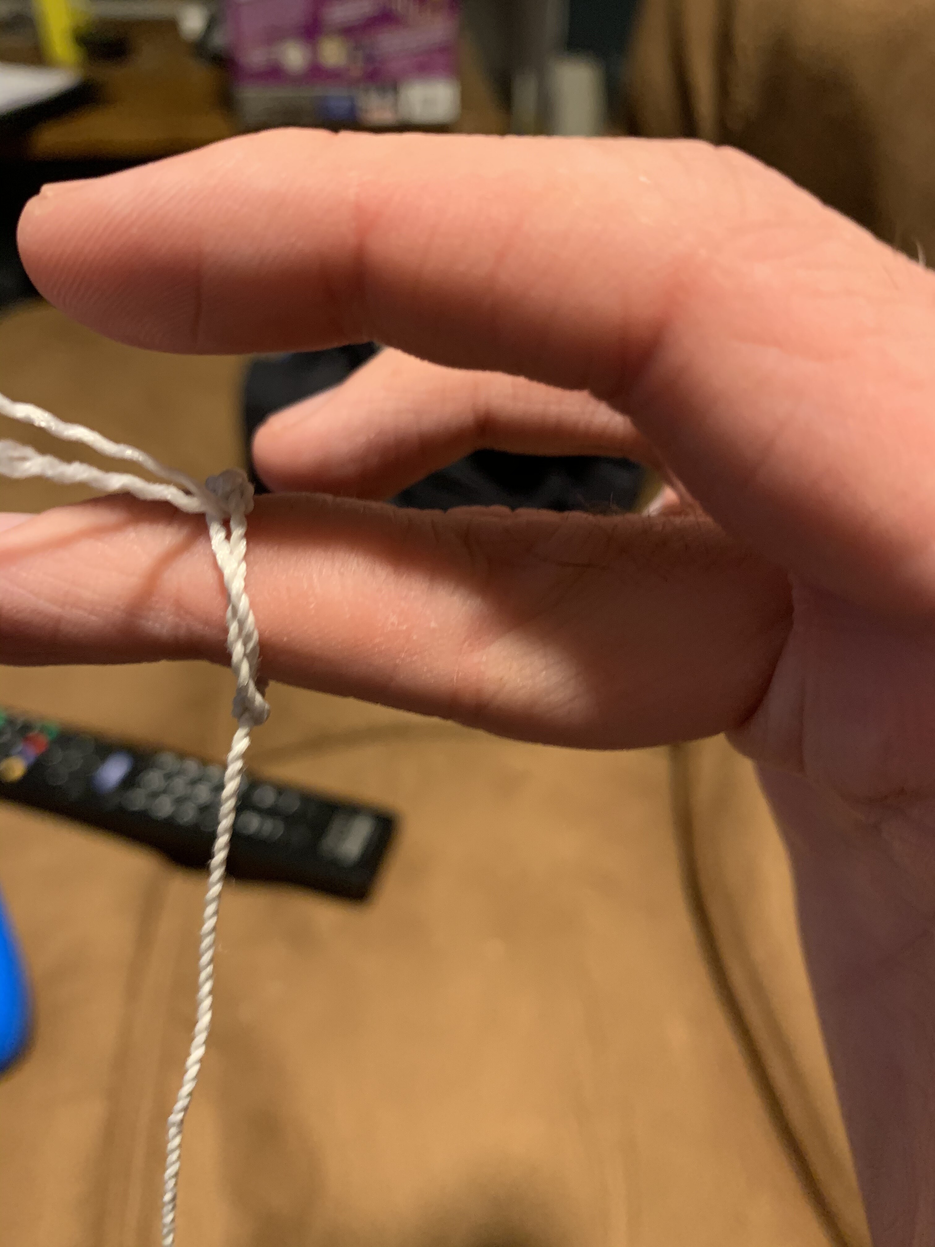 You want the bottom image, not the top. The original loop should be facing towards your pinky not your thumb.