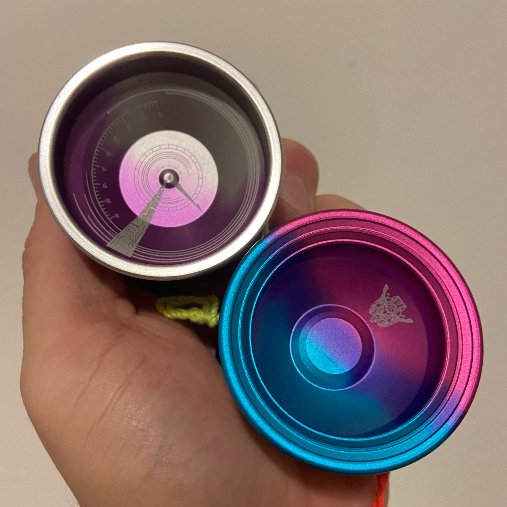 Yoyofriends Tachyon nmtbs and an mk1 dynames with a couple pin prick spots that break the anno. Both are 5/5 smooth no vibe at all. I am decluttering before I move soon and these two don’t see enough play but they are both good and fun. Tachyon is weird bc it is super light at 60g but also hella powerful and stable bc bimetal.