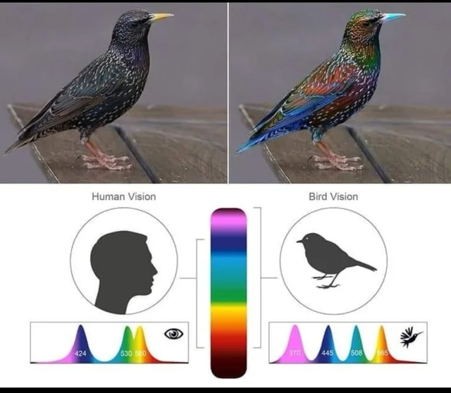 Comparatively, birds see a wider range of colours than we do. This illustrates a comparison, but honestly we can’t even imagine the range of what they see because it’s not in our comprehension.